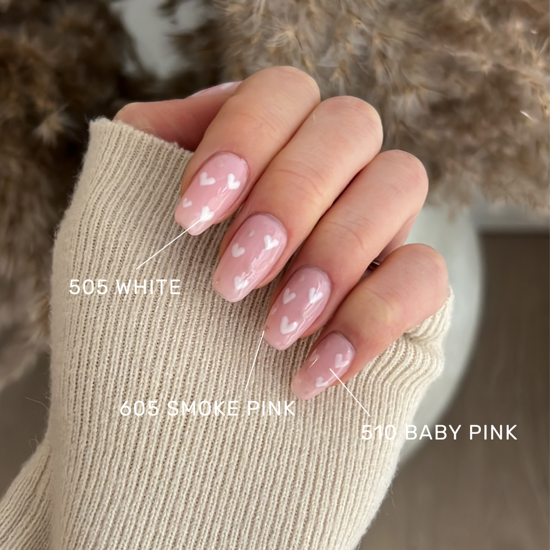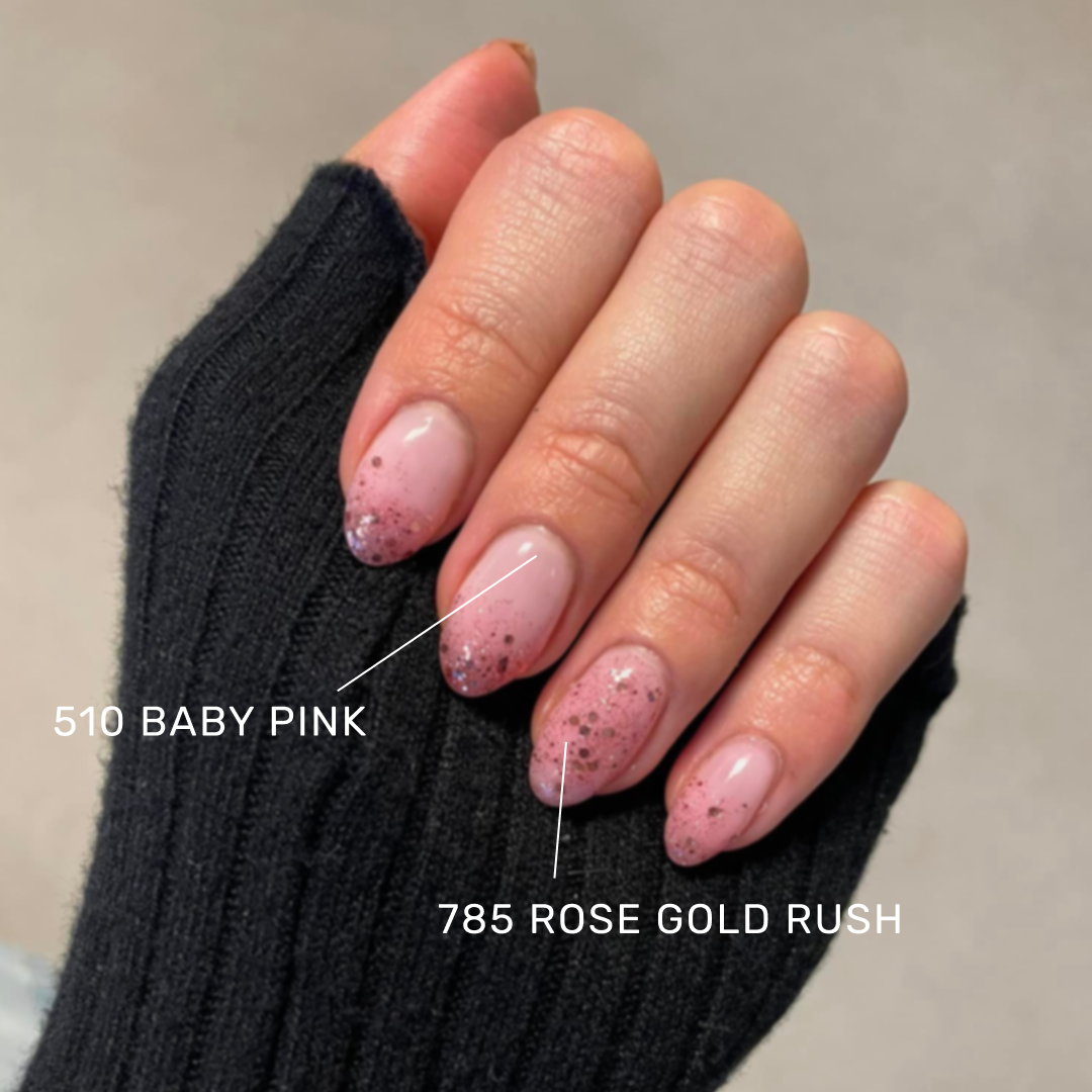 510 Baby Pink from The Gel Collection is a beautiful, light, and classic transparent pink. It is very transparent with 1-2 layers, but can become fully opaque with 3-4 layers. It can be used on its own, but is also perfect as a base color for French nails or to create ombre/babyboomer designs.