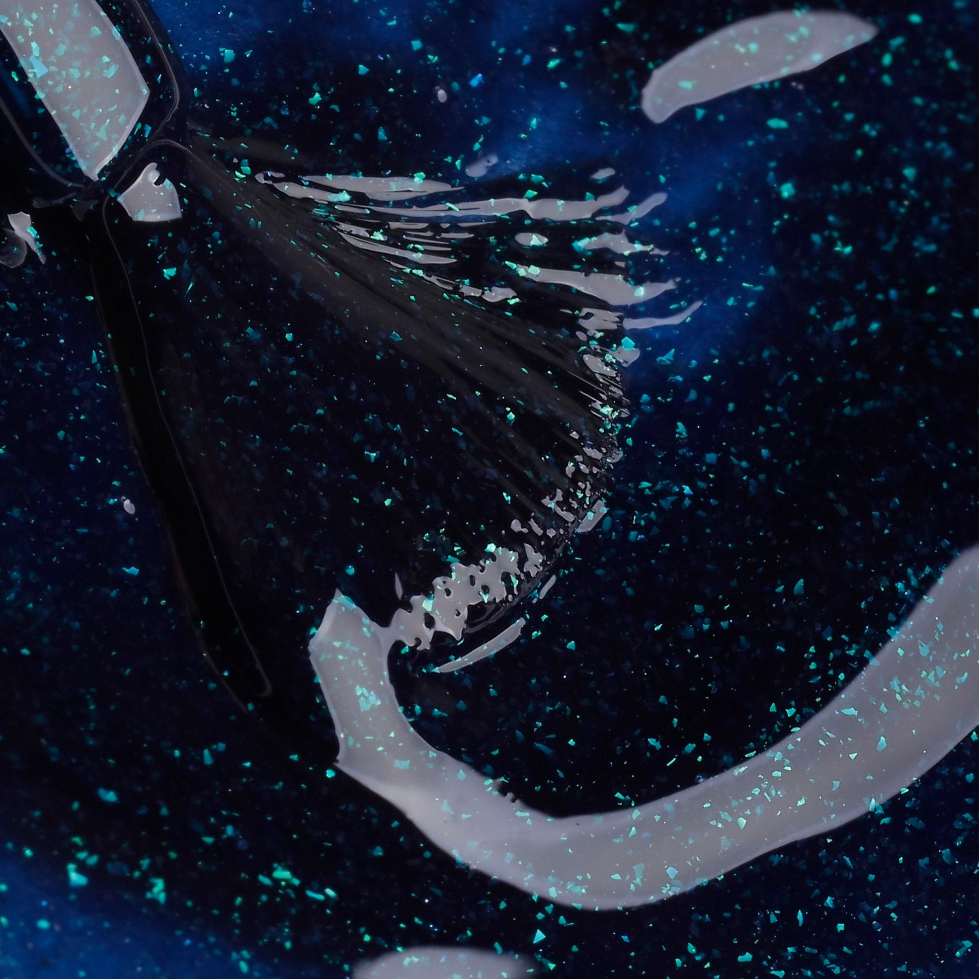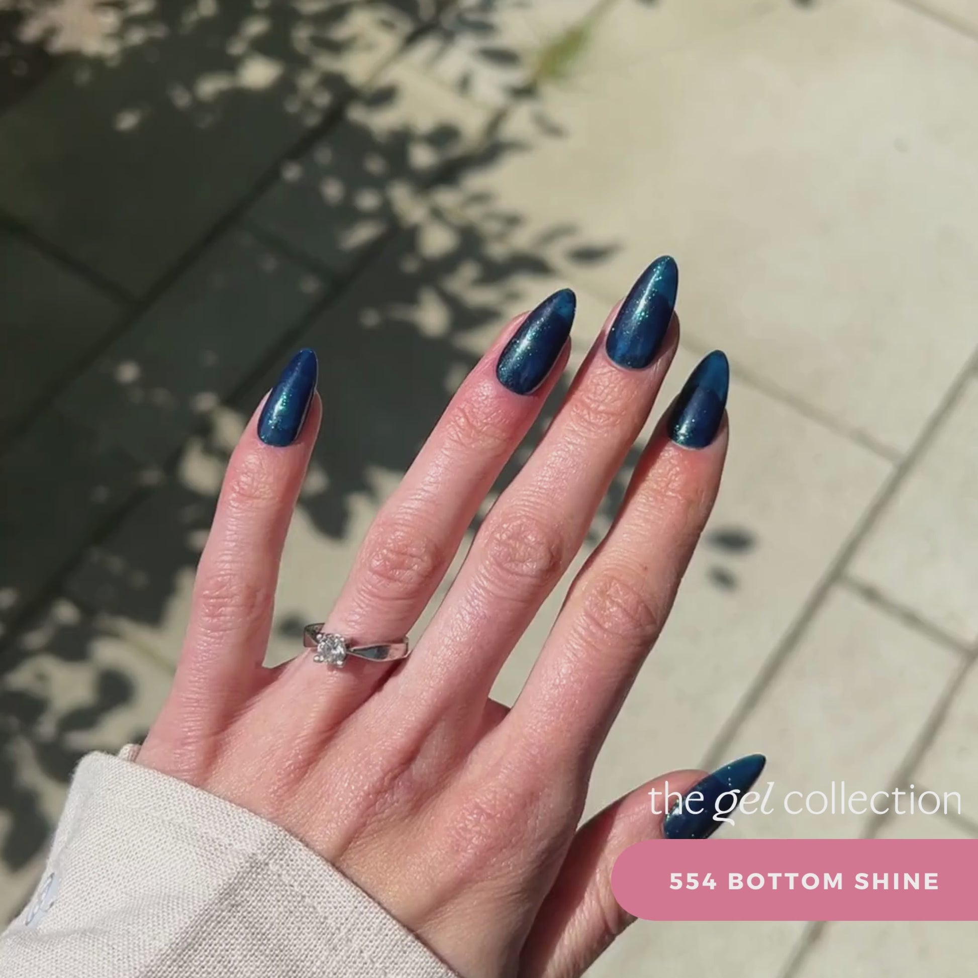 554 Bottom Shine from The Gel Collection is midnight blue with small fine glitter pieces in green and blue shades. It is vibrant and mysterious. Bottom Shine is like looking up at a night sky filled with stars, where each star is a sparkling pearl of light.