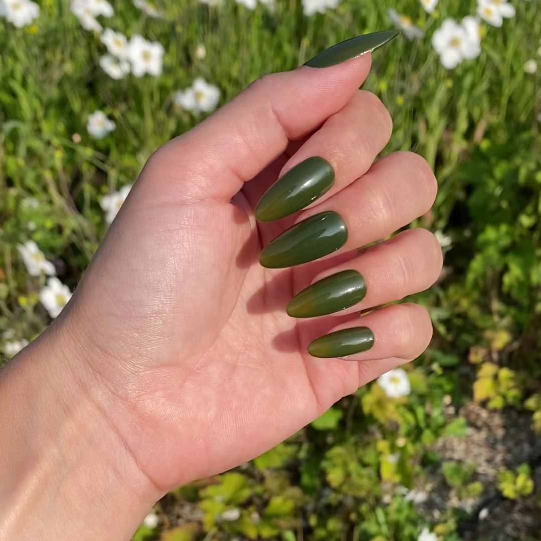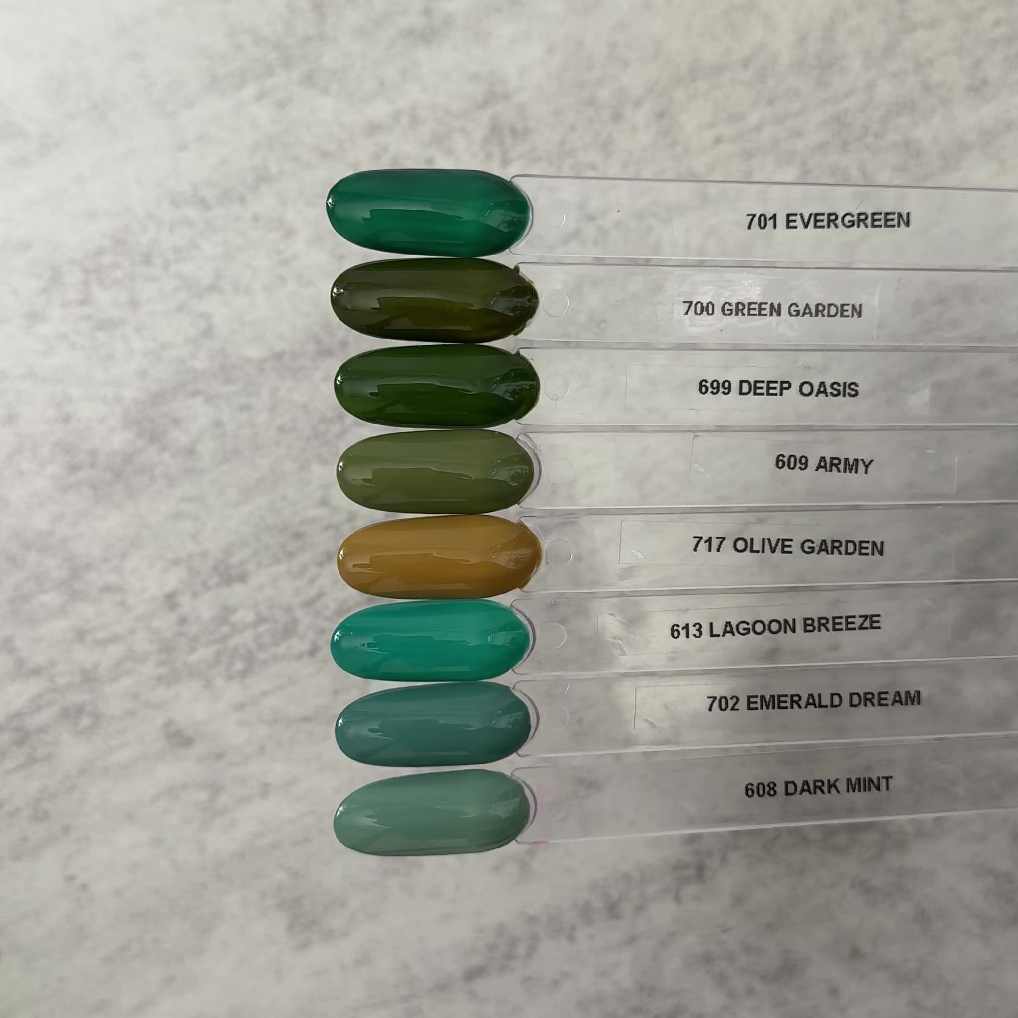 700 Green Garden from The Gel Collection is a deep, dark green that captures the essence of a deep warm tone with a hint of yellow. The depth and intensity of the color are designed to give your nails a touch of elegance and sophistication