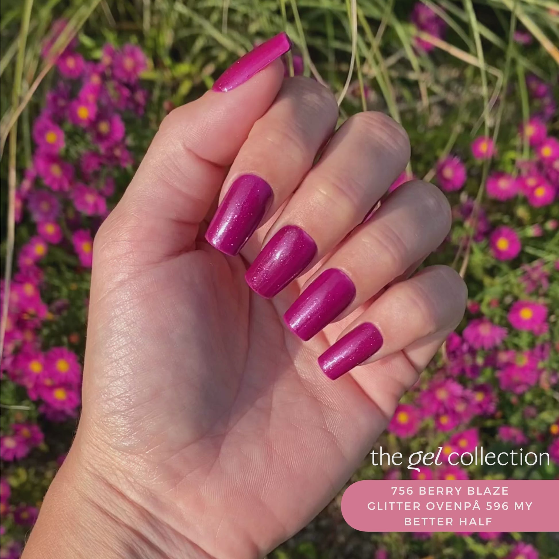 756 Berry Blaze Glitter from The Gel Collection is a beautiful purple with fine small multicolored glitter pieces in it. The color sparkles so beautifully in the light.