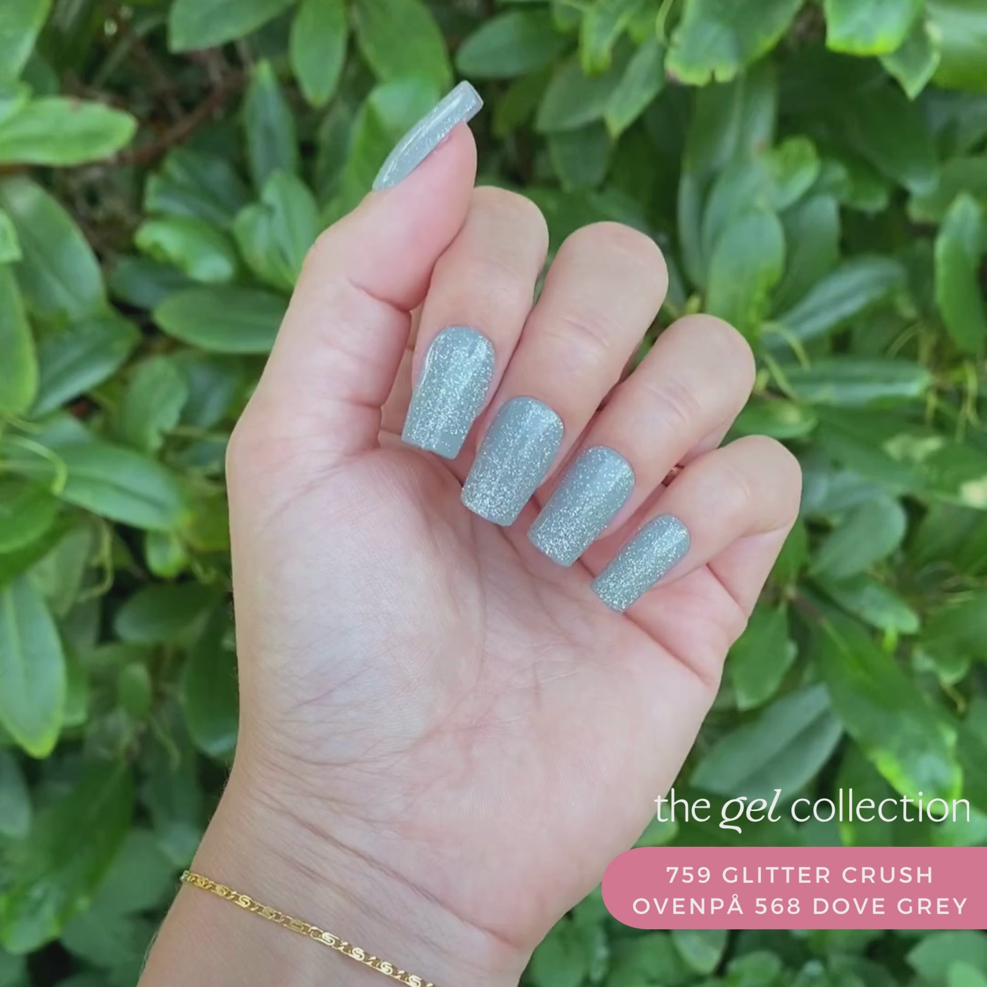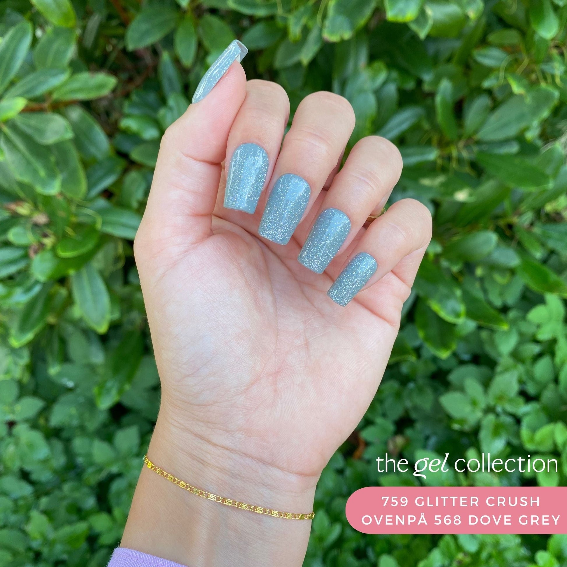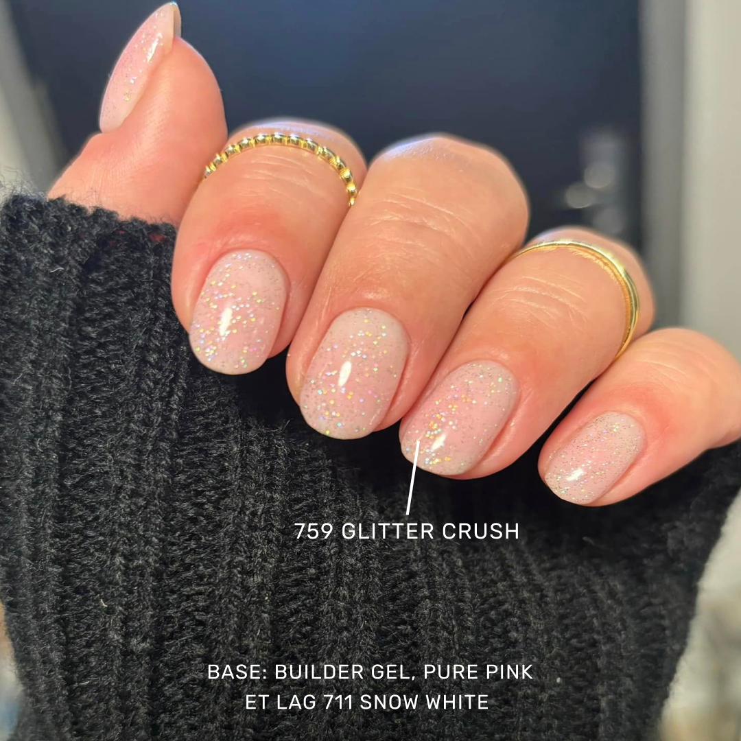 759 Glitter Crush from The Gel Collection is a clear transparent with fine silver glitter. This glitter color is perfect to use on top of your other favorite colors.