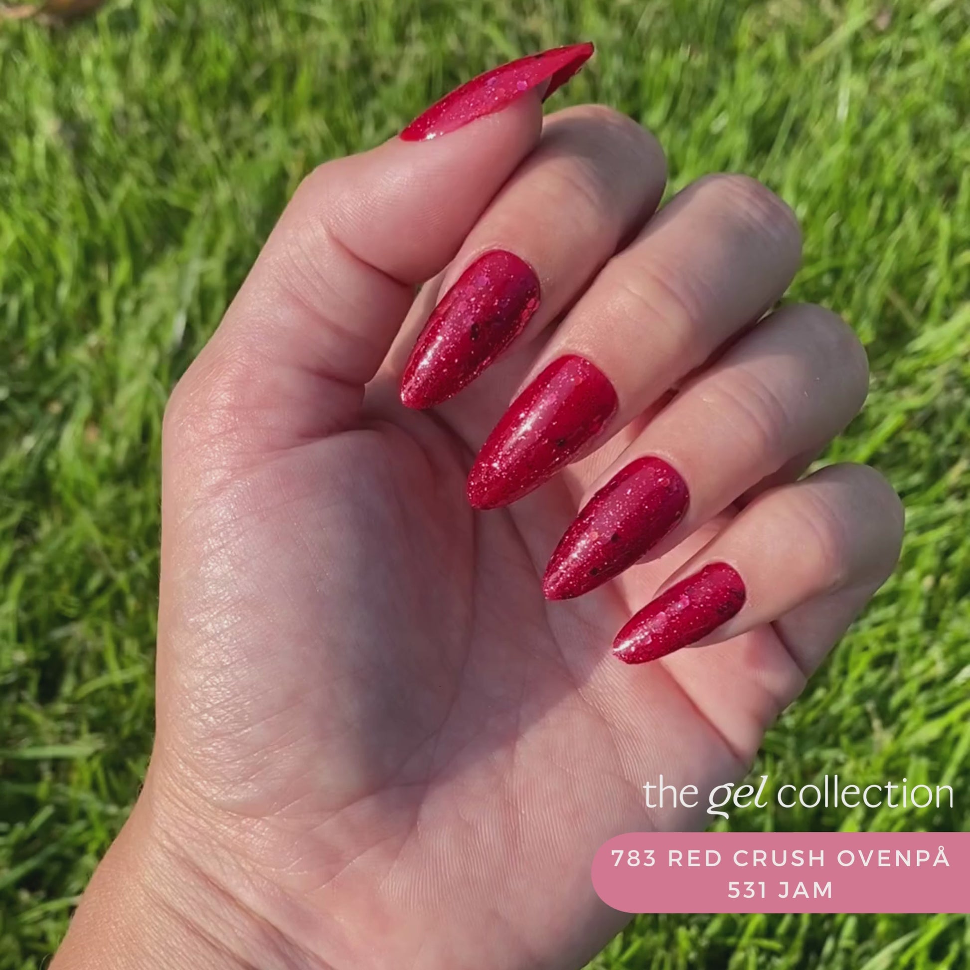 783 Red Crush from The Gel Collection is a semi-transparent red with extra glitter. This sparkling combination adds instant glamour and drama to your nails.