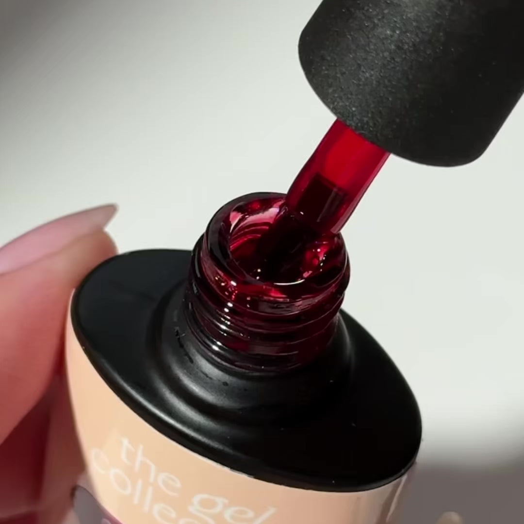 848 Cherry Glaze from The Gel Collection is a Jelly Gel Polish in a deep cherry red shade with a transparent, glossy finish. The colour feels juicy and vibrant – like a layer of liquid cherry syrup on your nails.