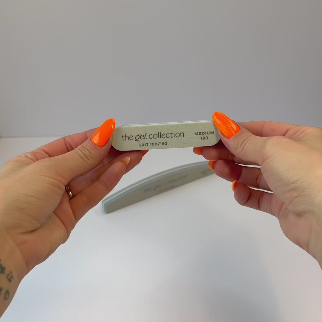 To ensure flexibility in your filing work, the file offers two different grits: 100 (coarse) and 180 (medium). Grit 100 is good for smoothing the surface of hard products, and grit 180 is good for creating roughness in the top layer of the nail before applying product (prep) and removing excess gel after removal.