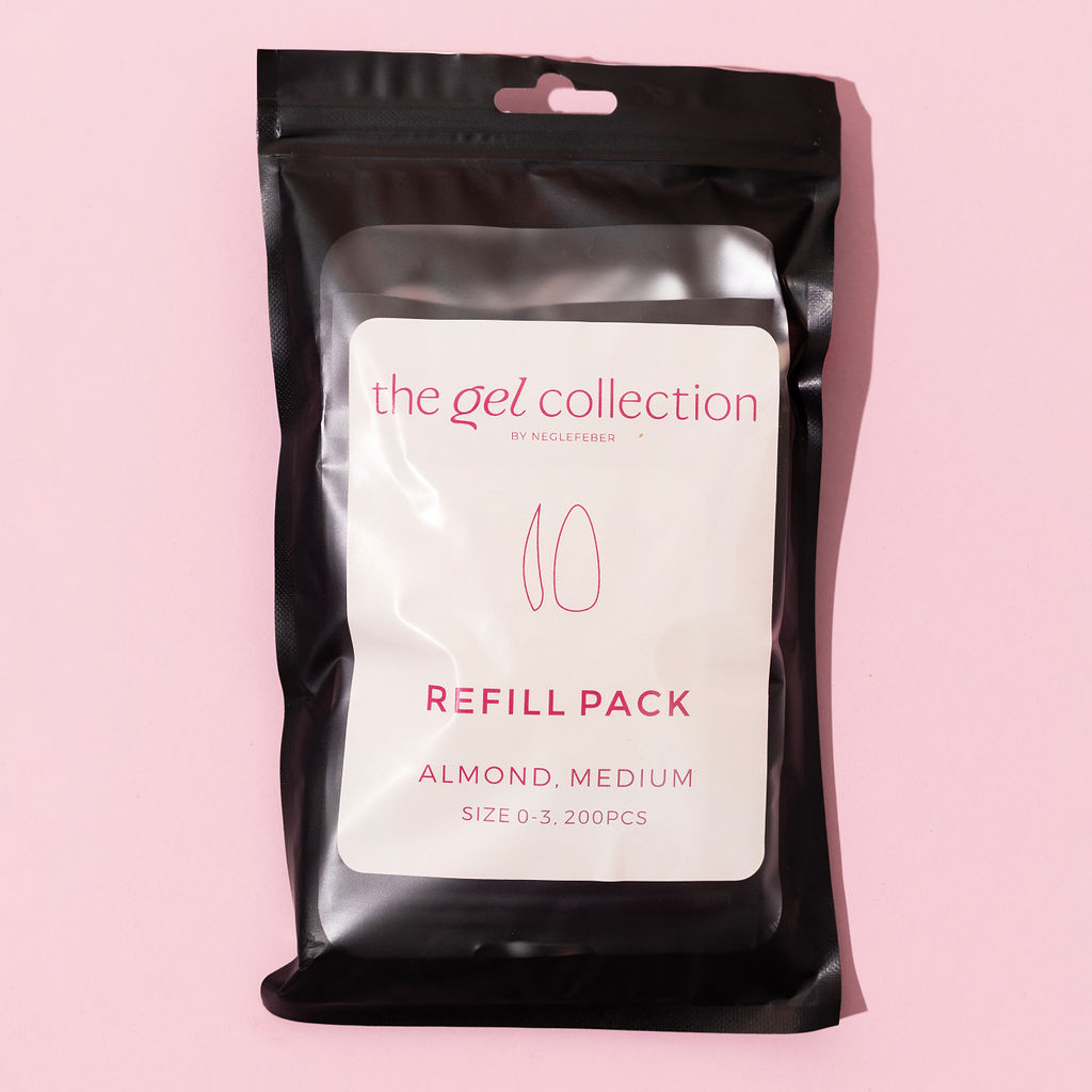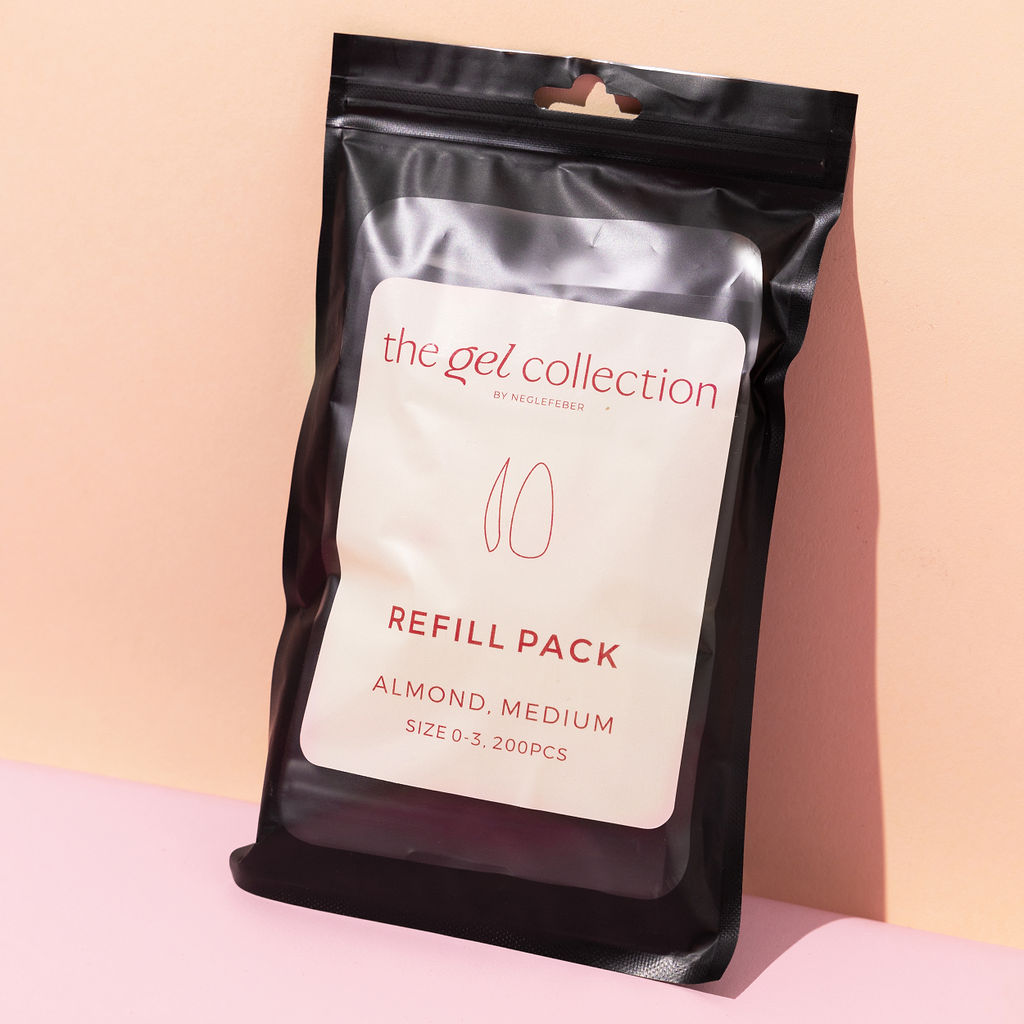 This refill bag with Soft Gel Press On Tips contains a total of 4 x 50 pcs. tips. That is a total of 200 pcs. distributed over 4 different sizes. They are intended to be used as a refill when you run out of the given sizes.