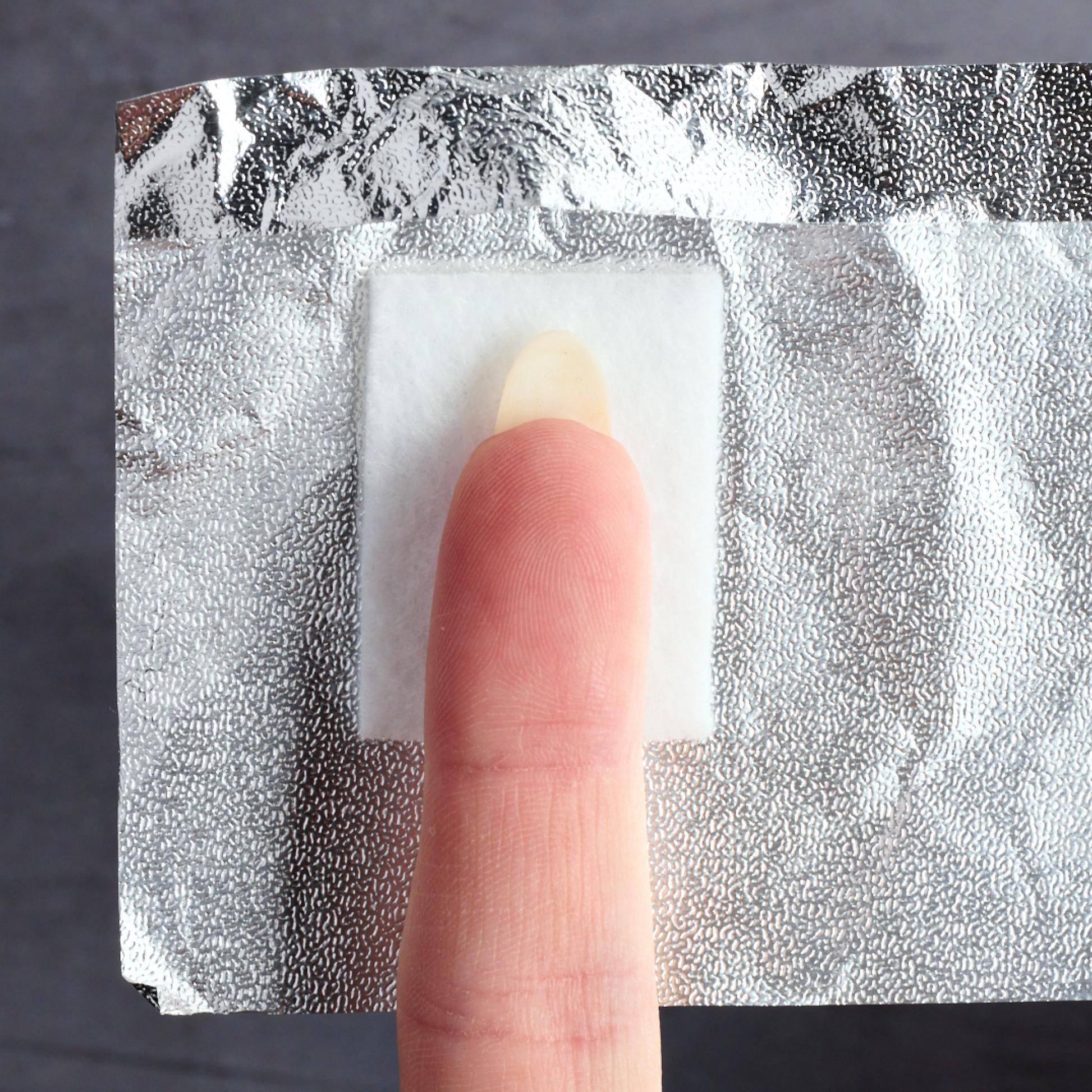 Each wrap is pre-sized and has a piece of absorbent cotton attached in the middle. All you need to do is saturate the cotton with acetone and close the foil by twisting it around the finger. Wait for 10-15 minutes, after which your soak off product is ready to be scraped off.